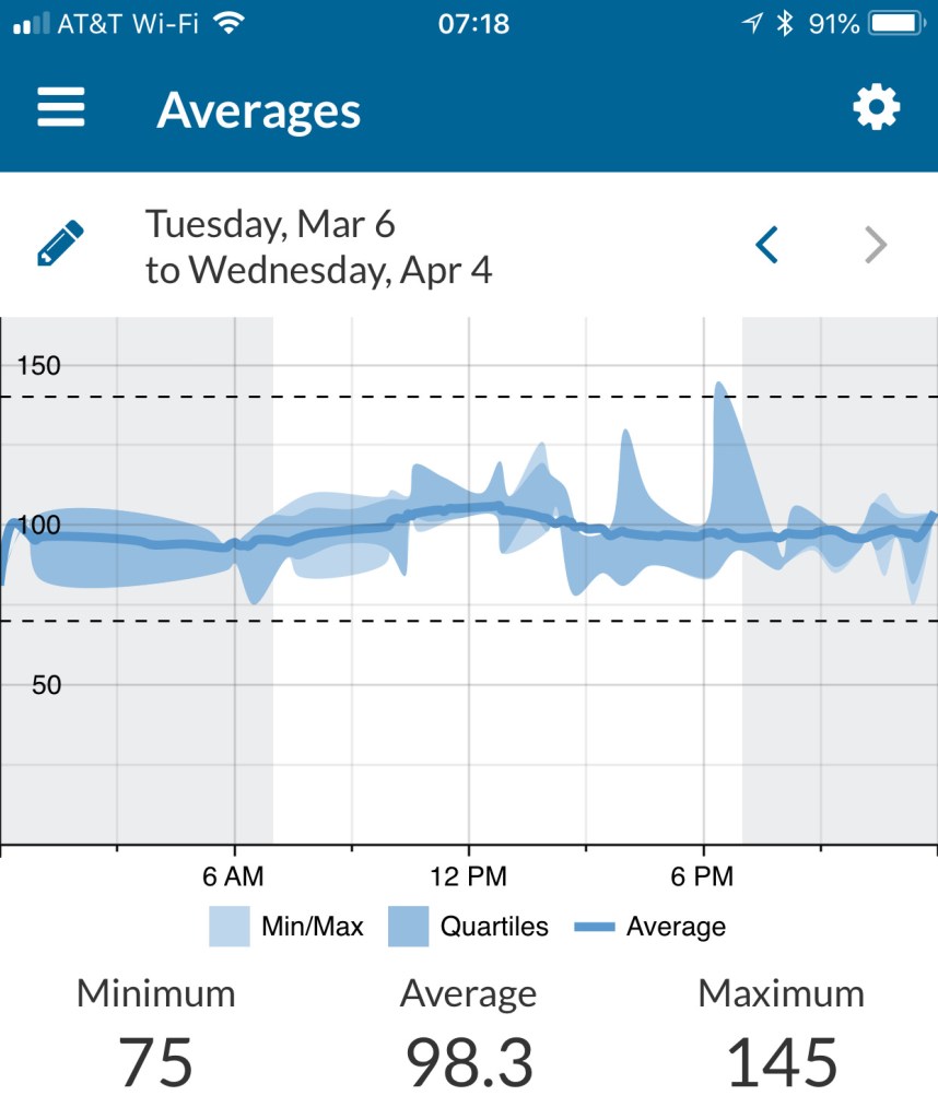 Sure enough, my average blood glucose came down. Here’s my 30 day average from about a year ago.